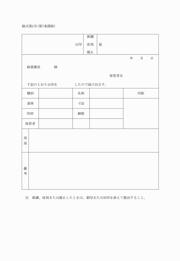 3 保管者は、公印を新調、改刻または廃止したときは、速やかに、公印新調、改刻、廃止届(様式第2号)を総務課長に提出しなければならない。