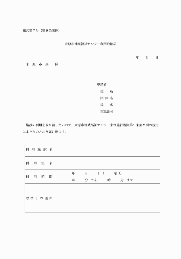 2 利用者は、許可を受けた施設の利用を取り消そうとするときは、地域福祉センター利用取消届(様式第7号)に許可書を添えて、速やかに市長に届け出なければならない。