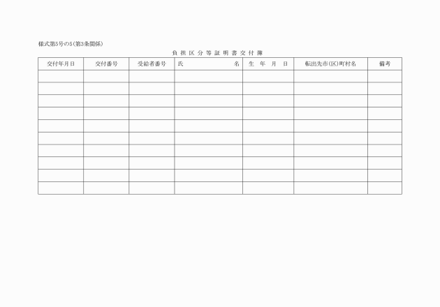第8条の2 負担区分等証明書交付簿は、他の市町村への転出に際し、第15条第3項第3号に規定する負担区分等証明書を交付するときに整理するものとする。