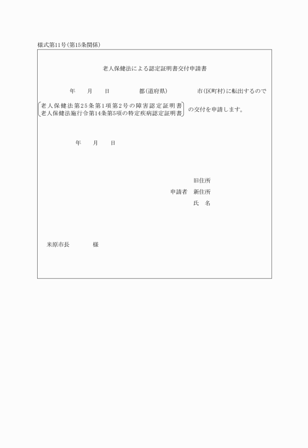 第11条 老人保健法による医療の受給資格変更届書(様式第8号。以下「受給資格変更届書」という。)により施行規則第6条に規定する氏名変更の届出、施行規則第7条に規定する居住地の変更の届出または施行規則第8条の2第1項に規定する法第25条第7項の規定の適用を受ける旨の届出もしくは継続居住地変更の届出を受けたときは、次により処理するものとする。