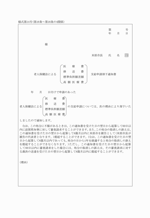 ア 老人保健法による医療費支給申請却下通知書(様式第14号)を作成し、申請者に通知すること。