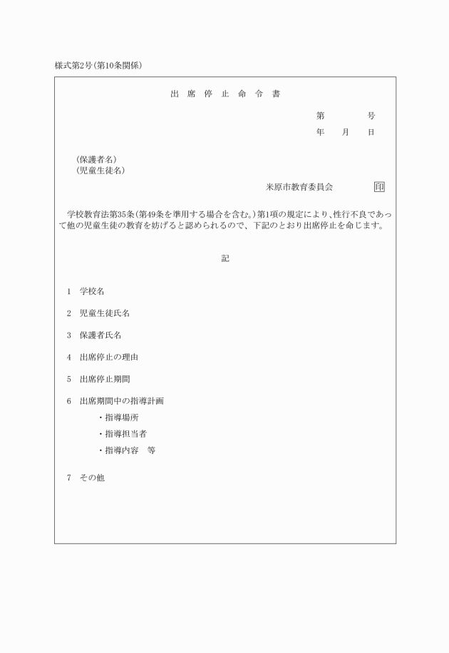 第10条 法第35条第2項の文書は、出席停止命令書(様式第2号)とする。