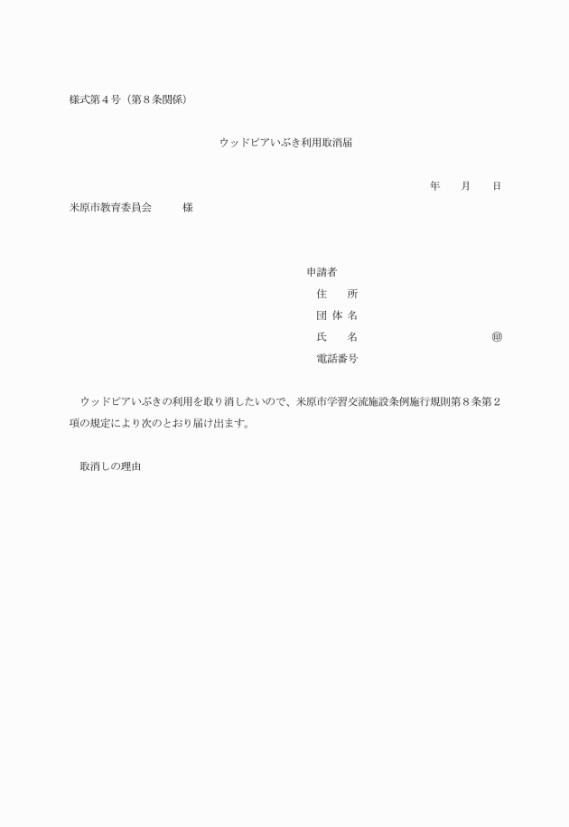 2 利用者は、許可を受けた施設の利用を取り消そうとするときは、ウッドピアいぶき利用取消届(様式第4号)に許可書を添えて、速やかに教育委員会に届け出なければならない。