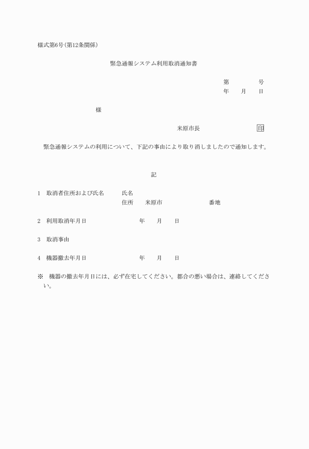 第13条 利用者またはその親族は、第11条第1項第1号から第4号までのいずれかに該当するとき、または前条の規定により利用の取消しを受けたときは、速やかに貸与された機器を市長に返還しなければならない。