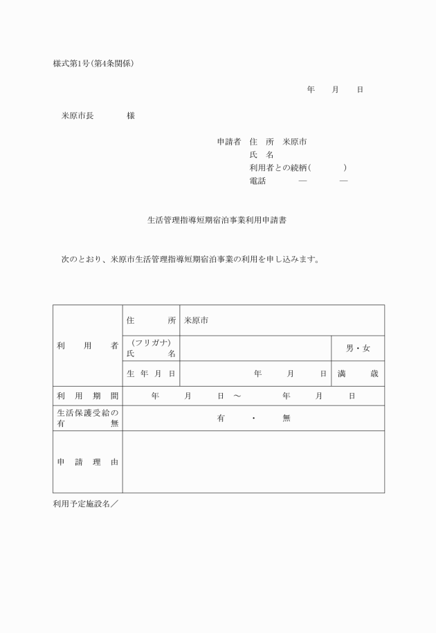 第4条 事業を利用しようとする者(以下「申請者」という。)は、生活管理指導短期宿泊事業利用申請書(様式第1号)を市長に提出しなければならない。