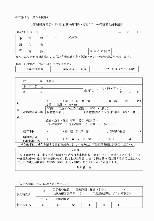 第6条 第2条に規定する事業の助成を受けようとする者(以下「申請者」という。)は、第2条各号の助成事業から一つを選択し、重度障がい者(児)自動車燃料費・福祉タクシー運賃・リフト付きタクシー運賃助成申請書(様式第1号。以下「申請書」という。)を市長に提出し、身体障害者手帳、療育手帳または精神障害者保健福祉手帳(以下「障がい者手帳」という。)を提示しなければならない。ただし、自動車燃料費助成事業の申請者は、次の各号に掲げるものを提示しなければならない。