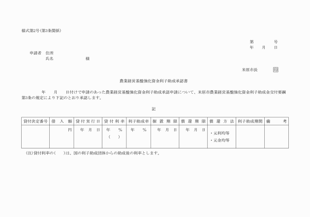 第3条 申請者は、資金借入後、速やかに農業経営基盤強化資金利子助成承認申請書(様式第1号)に借用証書の写しおよび償還年次表の写しを添付し、市長に提出しなければならない。