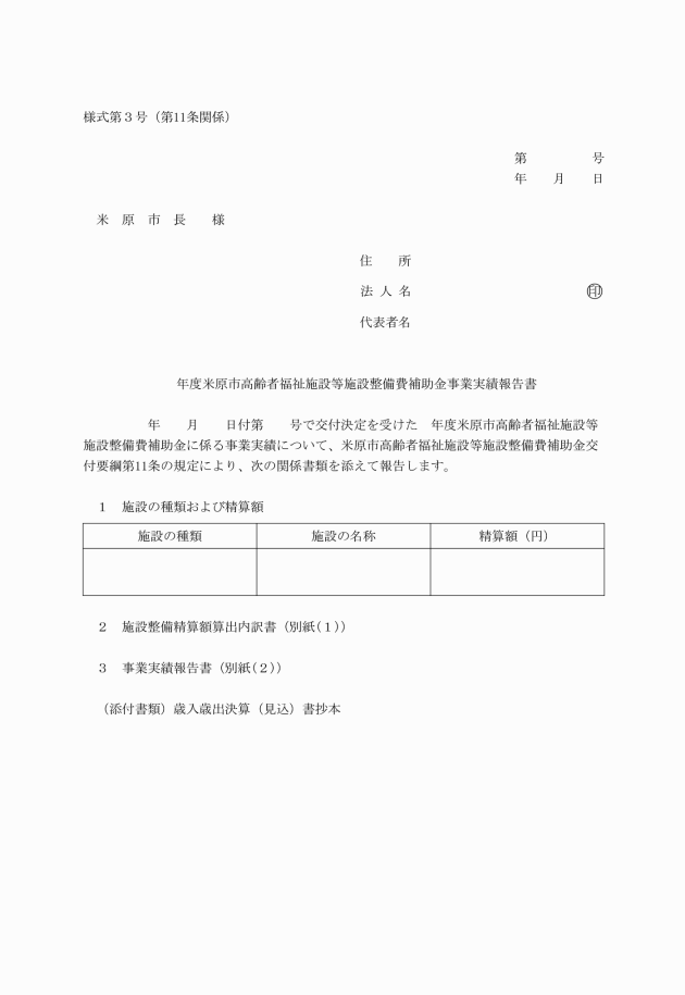 第11条 補助事業が完了した補助事業者は、米原市高齢者福祉施設等施設整備費補助金事業実績報告書(様式第3号)を、事業完了後1箇月以内または、補助金等交付決定の日の属する年度の翌年度の4月10日のいずれかの早い日までに市長に提出しなければならない。
