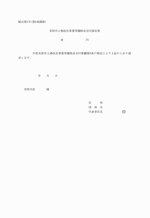 第8条 補助金の交付を受けようとする者は、土地改良事業等補助金交付請求書(様式第5号)を市長に提出しなければならない。