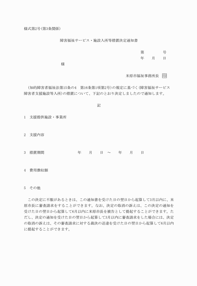 第3条 所長は、法第15条の4の規定による障害福祉サービスの提供措置または法第16条第1項第2号の規定による障害者支援施設等への入所措置を行うことを決定したときは、障害福祉サービス・施設入所等措置決定通知書(様式第2号)により当該知的障がい者またはその扶養義務者に通知するものとする。