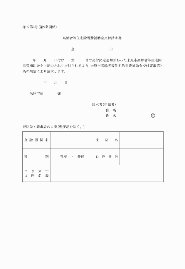 第6条 補助金の交付を受けようとする者(以下「申請者」という。)は、補助事業が完了後、速やかに民生委員児童委員の証明を受け、高齢者等住宅除雪費補助金交付申請書(様式第1号)に領収書の写しその他関係書類を添付して市長に提出しなければならない。