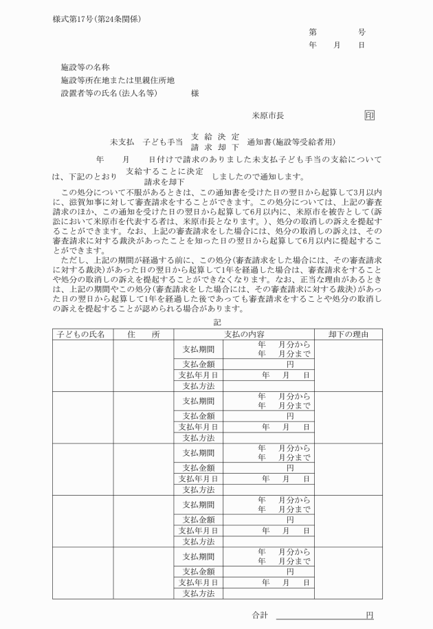 エ 請求者が施設等受給資格者または施設等受給資格者であった者である場合は、受給者台帳(施設等受給者用)の当該請求に係る施設入所等子どもであった者の備考欄に請求を却下した旨を記入すること。