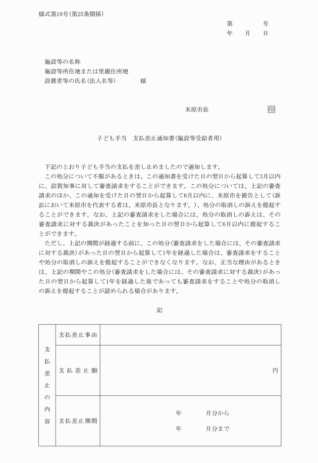 第19条 市長は、省令第9条の届書(以下「受給事由消滅届」という。)の提出を受けたときは、次により処理するものとする。