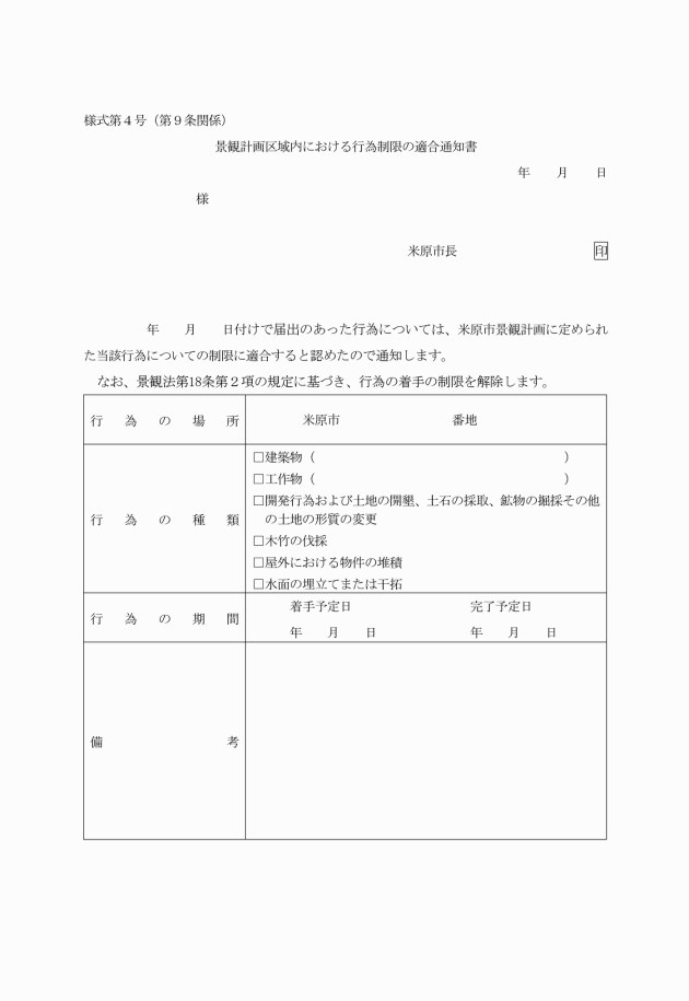 第9条 市長は、法第16条第1項または第2項の規定による届出があった場合において、その届出に係る行為が景観計画に定められた当該行為についての制限に適合すると認めるときは、景観計画区域内における行為制限の適合通知書(様式第4号)により通知するものとする。