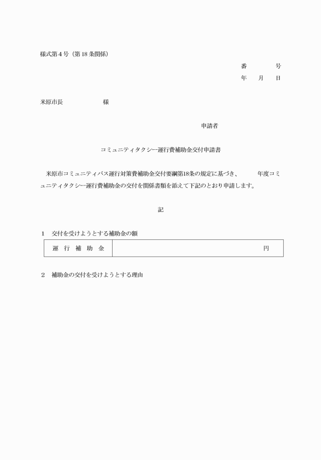 第1条 この要綱は、地域住民にとって必要不可欠なコミュニティバスまたはコミュニティタクシーの運行により、欠損を生じた乗合事業者に対し、地域住民の福祉を確保するとともに乗合事業者の自立を図るため、予算の範囲内で補助金を交付することについて、滋賀県コミュニティバス運行対策費補助金交付要綱(平成15年滋交政第258号。以下「県要綱」という。)および米原市補助金等交付規則(平成17年米原市規則第35号。以下「規則」という。)に規定するもののほか、この要綱に定めるところによる。