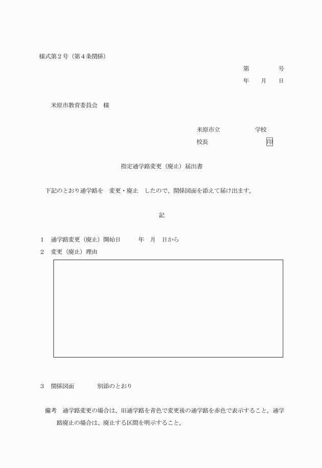 2 校長は、指定した通学路を廃止し、または変更したときは、直ちに指定通学路変更(廃止)届出書(様式第2号)に関係図面を添えて教育委員会に提出しなければならない。