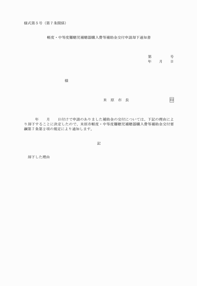 2 市長は、補助を行わないことを決定した場合は、軽度・中等度難聴児補聴器購入費等補助金交付申請却下通知書(様式第5号)により、申請者に通知するものとする。