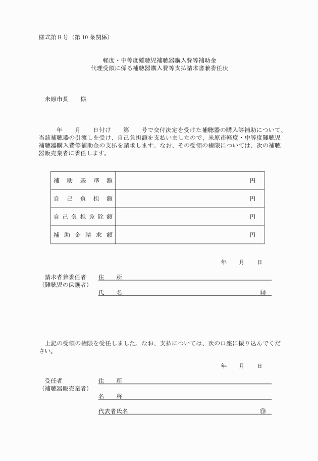 第6条 補助金の交付を受けようとする対象児童の保護者(以下「申請者」という。)は、軽度・中等度難聴児補聴器購入費等補助金交付申請書(様式第1号)に次に掲げる書類を添えて市長に申請しなければならない。
