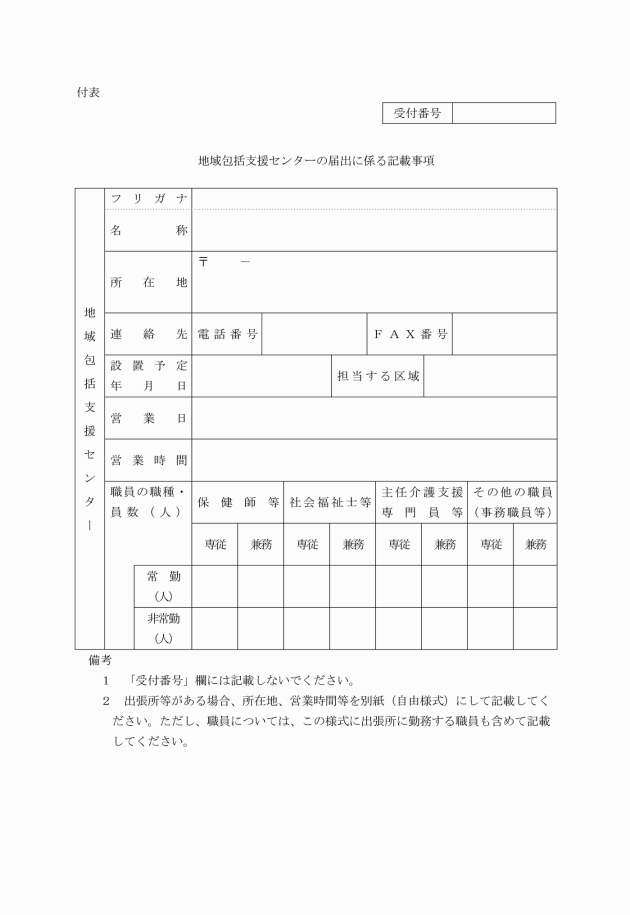 第2条 法第115条の46第3項の規定により、地域包括支援センターの設置の届出をしようとする者は、地域包括支援センター設置届出書(様式第1号)に必要書類を添えて、市長に届け出なければならない。