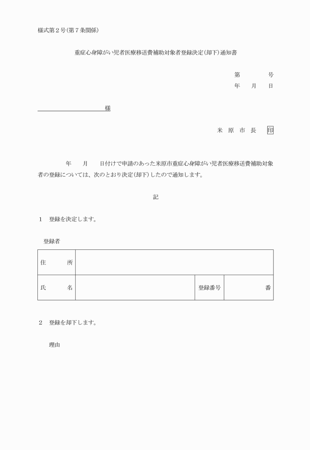 第6条 補助金の交付を受けようとする者は、あらかじめ重症心身障がい児者医療移送費補助対象者登録申請書(様式第1号)に身体障害者手帳の写し等の関係書類を添えて、市長に提出しなければならない。
