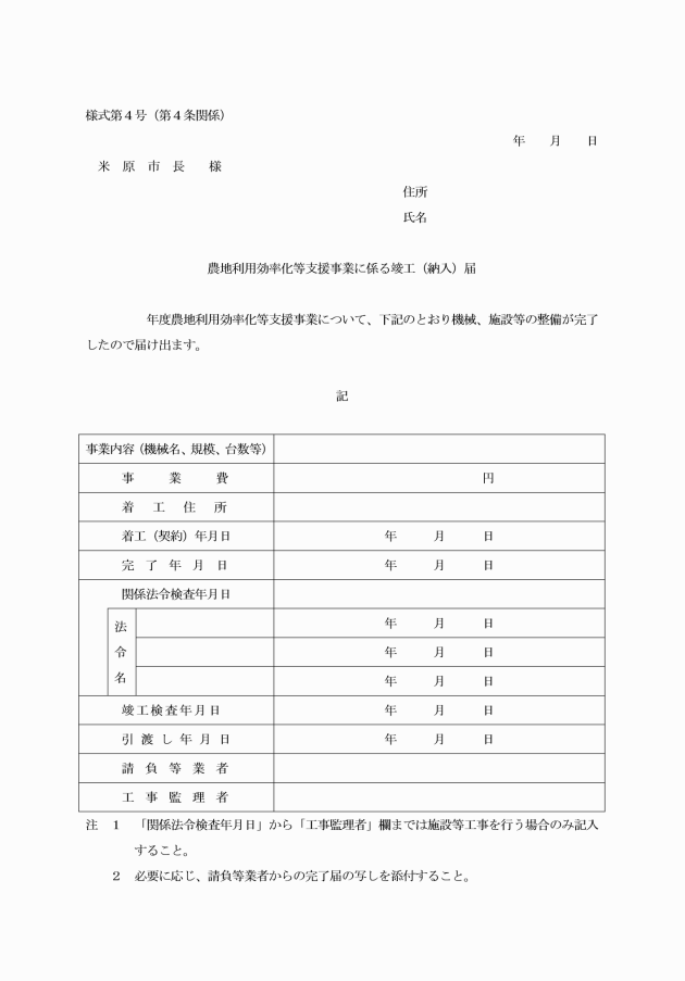 4 融資主体型等補助事業者は、農業用機械等の竣工(納入)が完了したときは、速やかに農地利用効率化等支援事業に係る竣工(納入)届(様式第4号)を市長に提出しなければならない。