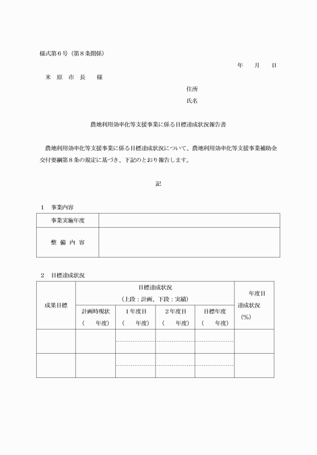 第8条 融資主体型等補助事業者は、補助事業の実施年度から目標年度までの間、目標達成状況を農地利用効率化等支援事業に係る目標達成状況報告書(様式第6号)により、毎年5月末日までに市長に報告するものとする。ただし、融資等活用型補助事業に係る補助金の交付を受けた者で、農業用機械以外の農業用施設等を整備する者の場合は、この限りでない。