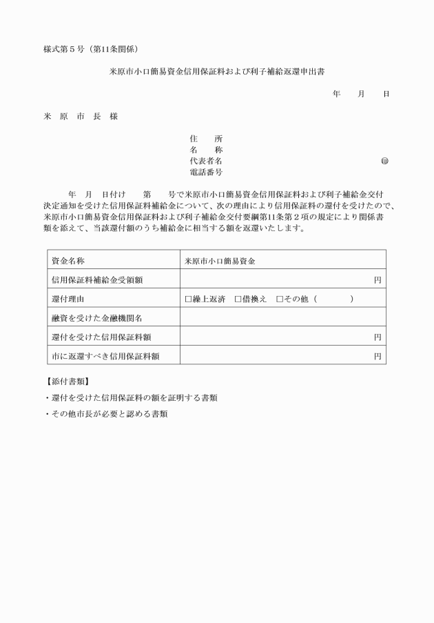 2 交付決定者が当該資金の繰上返済等により信用保証料の還付を受けた場合は、小口簡易資金信用保証料および利子補給返還申出書(様式第5号)を必要となる関係書類を添付して市長に提出し、当該還付額のうち補給金に相当する額を市に返還するものとする。