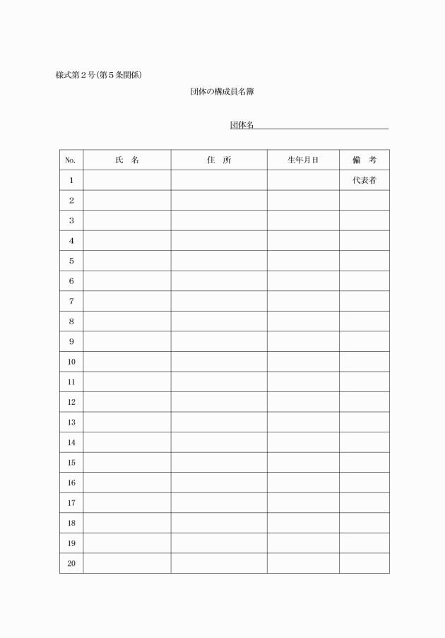 第5条 助成を受けようとする団体は、介護予防のための施設利用料助成団体登録申請書(様式第1号)に次に掲げる書類を添えて、市長に提出しなければならない。