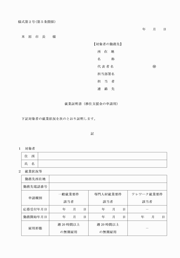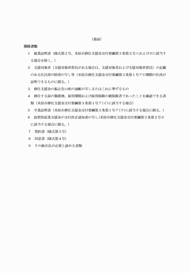 第5条 移住支援金の交付を受けようとする者は、移住支援金交付申請書(様式第1号)に次に掲げる関係書類を添えて、市長が別に定める日までに市長に提出しなければならない。