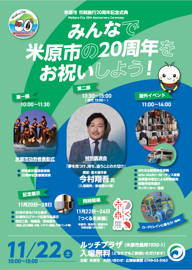 2005年2月14日、坂田郡山東町、坂田郡伊吹町、坂田郡米原町の3つの町が合併、2005年10月1日に坂田郡近江町も合併し米原市が誕生し、令和7年に市制20周年を迎えます。この記念すべき節目を機に、まち全体の一体感を醸成し、市民とともに未来を育て共に祝うため、記念式典を開催しますのでお知らせします。